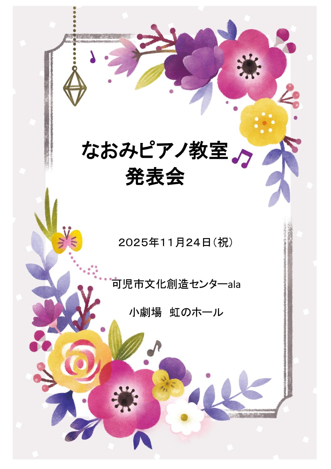2025年11月24日(祝)可児市文化創造センターala 虹のホールにて発表会を開催いたします。発表会は出演者のご家族、親戚の方はもちろん、お友達や一般の方も無料でご覧いただけます。音楽好きな方、ぜひお気軽にお越しくださいね♪